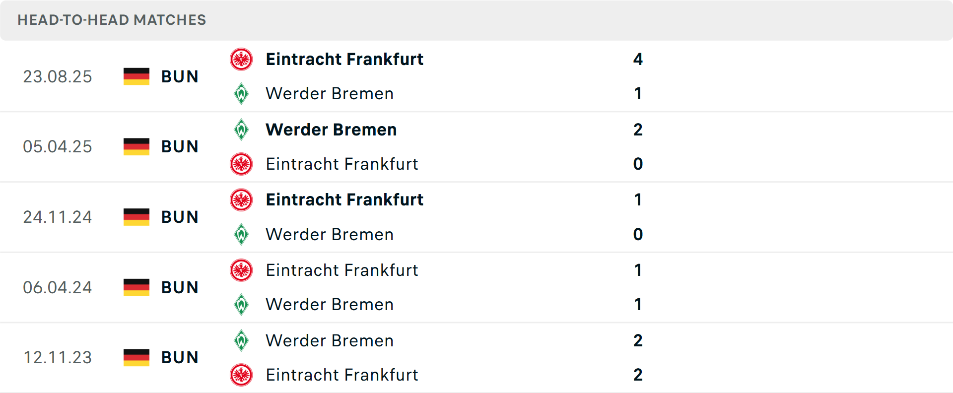 Tổng bàn thắng cả trận: Bremen lọt lưới 10 bàn ở 3 vòng gần đây tại La Liga. Trong khi đó, 2 trận vừa qua của Frankfurt vượt mốc tổng bàn thắng.