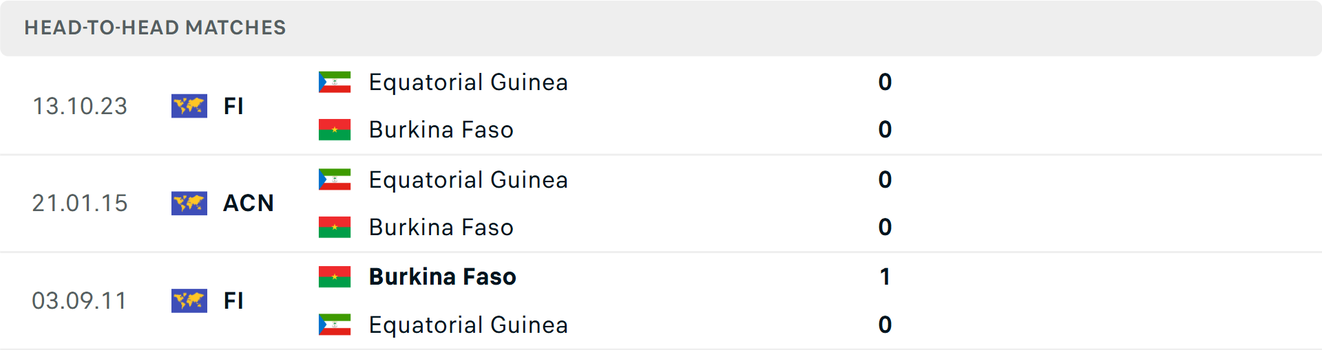 Tổng bàn thắng cả trận: 4/6 trận gần đây của Burkina Faso vượt mốc tổng bàn thắng. Phía bên kia, Guinea Xích đạo chỉ giữ sạch lưới 1/9 trận trước đó.
