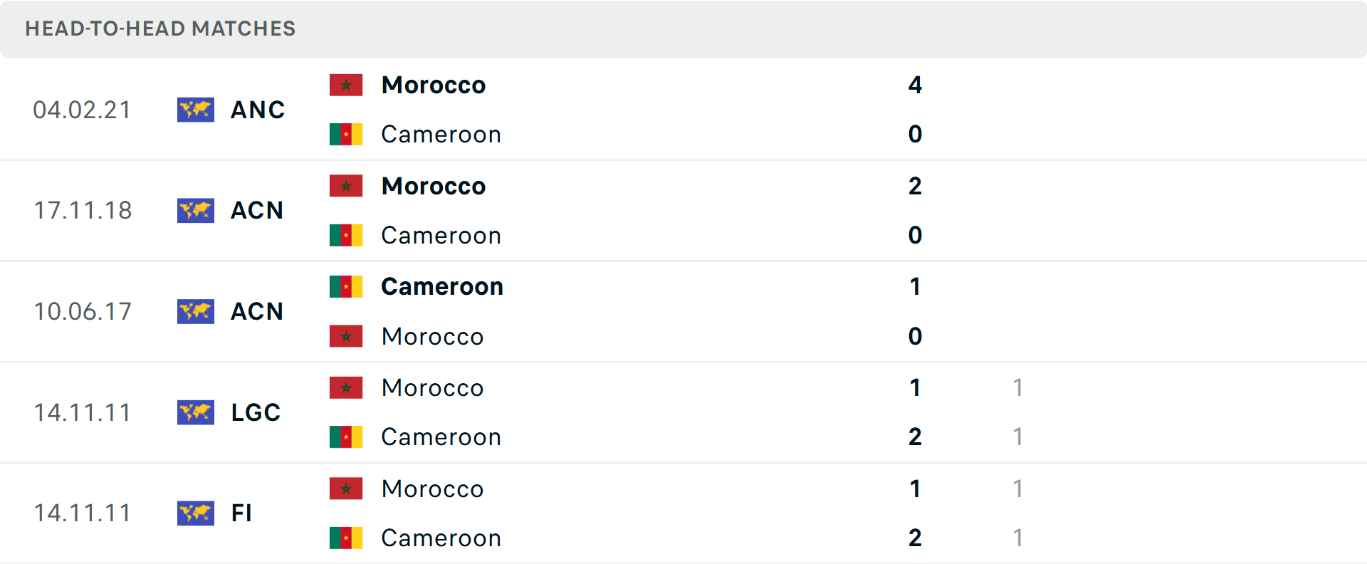 Tỷ lệ trận đấu: Cameroon thắng 3/4 trận vừa qua theo tỷ số châu Á. Phía bên kia, Ma rốc thua 3/5 trận mới nhất.