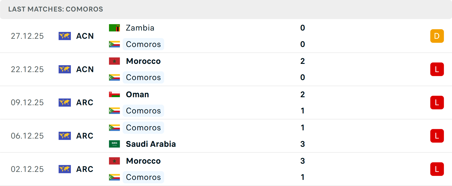 Comoros đối mặt với thử thách cực đại khi buộc phải thắng để nuôi hy vọng đi tiếp. Tuy nhiên, "The Coelacanths" vẫn chưa ghi được bàn thắng nào tại giải năm nay sau thất bại 0-2 trước Marốc và hòa 0-0 với Zambia. Dưới thời Stefano Cusin, Comoros chơi thực dụng và kỷ luật, nhưng sự yếu kém trên hàng công với 4 trận liên tiếp tịt ngòi đang là bài toán chưa có lời giải.