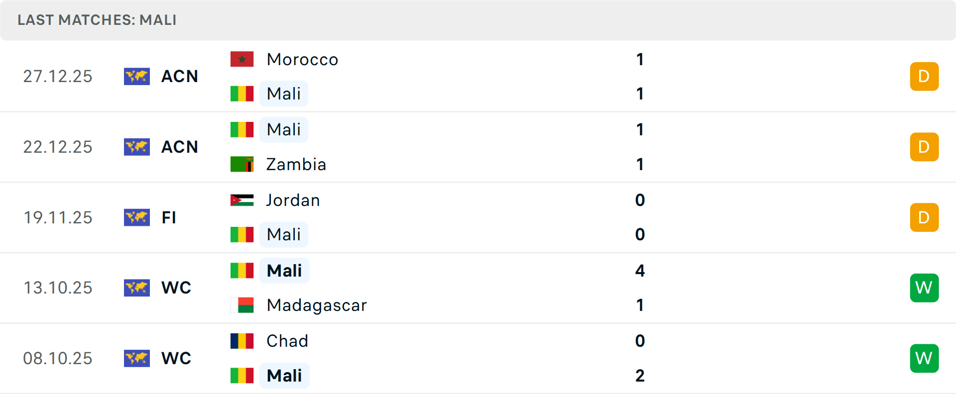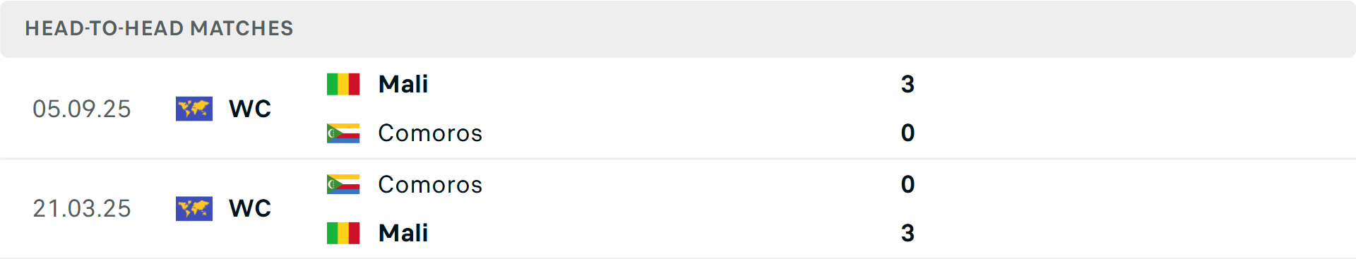 Về phần mình, Mali tiến vào trận đấu này với tâm thế bất bại sau hai trận hòa 1-1 đầy bản lĩnh trước Zambia và Marốc. Lassine Sinayoko đang thể hiện phong độ ấn tượng khi liên tục nổ súng trên chấm phạt đền. Lịch sử đối đầu cũng hoàn toàn ủng hộ "Những chú đại bàng" khi họ từng vùi dập Comoros hai lần cùng với tỷ số 3-0 tại vòng loại World Cup 2025 diễn ra hồi đầu năm.