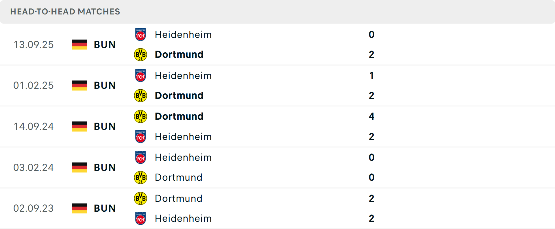 Tỷ lệ trận đấu: Dortmund thắng 5/8 trận gần đây ở Bundesliga theo tỷ số châu Á. Về phần mình, Heidenheim thua 4/6 trận vừa qua.