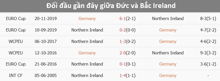 Tỷ lệ trận đấu: Đức toàn thua 4 trận gần đây theo tỷ số châu Á. Về phần mình, Bắc Ireland thắng cả 3 trận mới nhất, xa hơn là 6/8 trận.