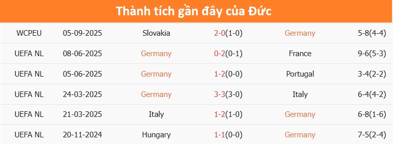 Đội tuyển Đức đang trải qua thời điểm tồi tệ nhất trong nhiều năm gần đây khi thua 3 trận liên tiếp. Thất bại trước Slovakia ở trận mở màn vòng loại World Cup làm dấy lên lo ngại về phong độ của đội bóng này. Dường như những sự vắng mặt của Musiala, Havertz, Fullkrug đã ảnh hưởng phần nào đến cả sức sáng tạo lẫn sự sắc bén trên hàng tấn công. Thực tế, Đức chỉ có 4/14 cú sút trúng đích ở trận thua Slovakia.