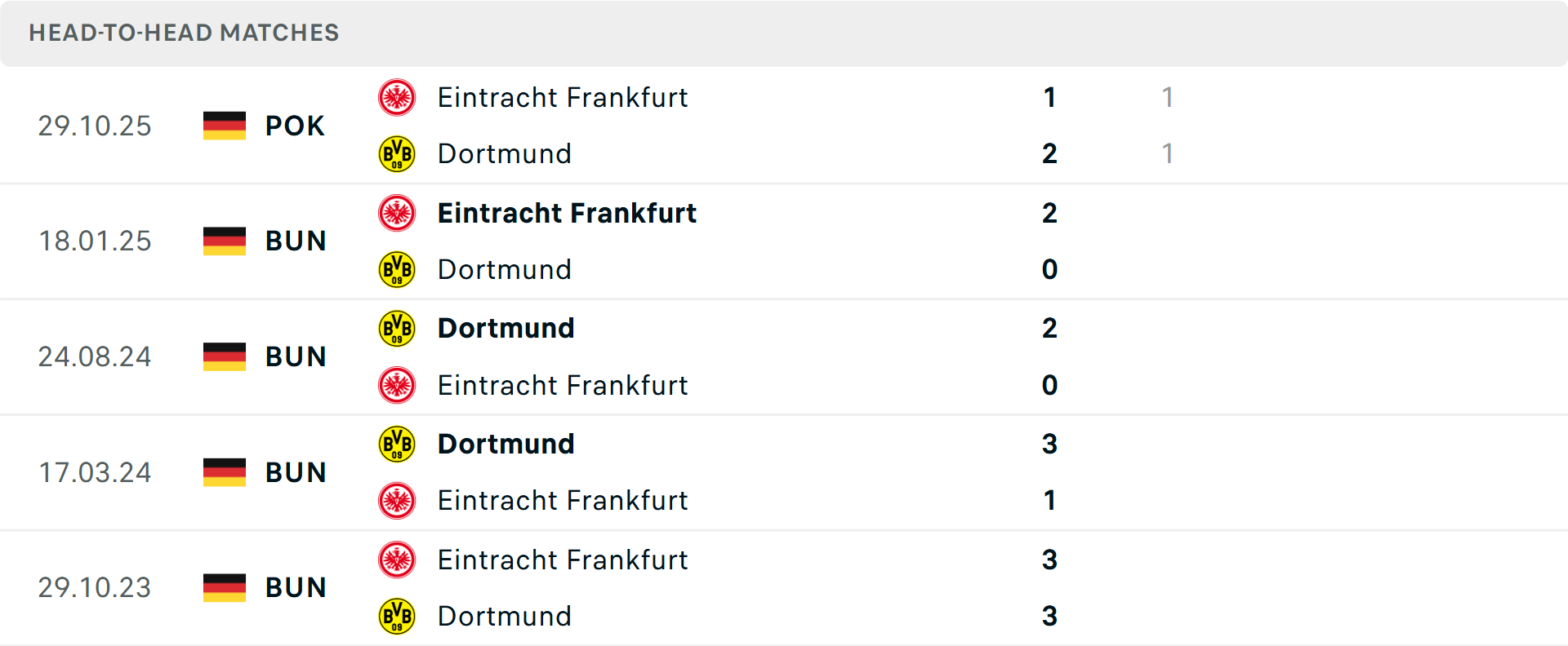 Phía đối diện, Dortmund dưới thời Niko Kovac đang có chuỗi 8 trận bất bại tại Bundesliga. Dù hy vọng vô địch mong manh, nhưng BVB cần chiến thắng để không bị Bayern Munich bỏ xa. Với hàng thủ chắc chắn (giữ sạch lưới 2/4 trận gần đây) và hỏa lực ổn định, đội khách được đánh giá nhỉnh hơn về chất lượng đội hình. Tuy nhiên, Frankfurt luôn là đối thủ khó chịu khi chơi trên sân nhà.