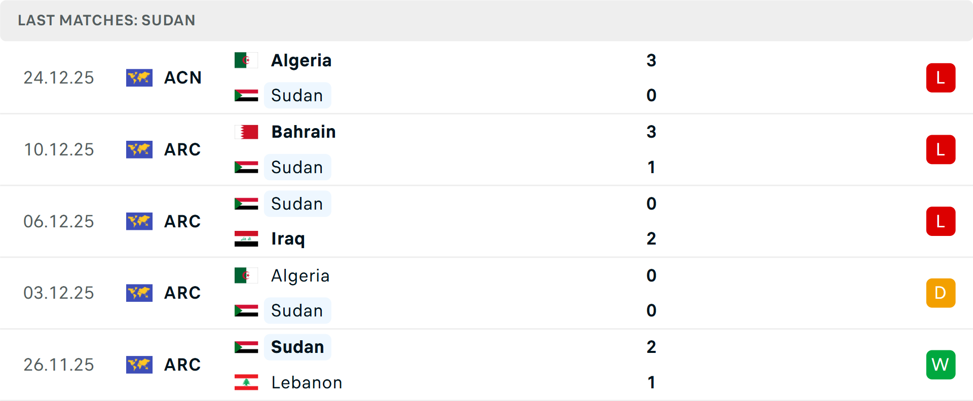 Phía bên kia chiến tuyến, Sudan đang lún sâu vào khó khăn với chuỗi 3 trận thua liên tiếp, chỉ ghi được duy nhất 1 bàn thắng. Thất bại 0-3 trước Algeria đã phơi bày mọi yếu điểm của "Những chú chim ưng Jediane". Với việc đứng thấp hơn đối thủ 20 bậc trên bảng xếp hạng FIFA, Sudan khó lòng đứng vững trước sức ép từ đội bóng từng ghi bàn nhiều nhất vòng bảng kỳ trước.
