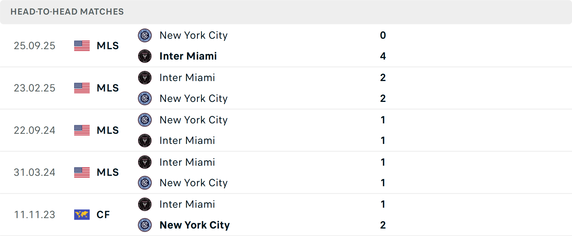 Tỷ lệ trận đấu: Inter Miami thắng 6/7 trận gần đây theo tỷ số châu Á. Phía bên kia, New York City cũng thắng 2 trận mới nhất.