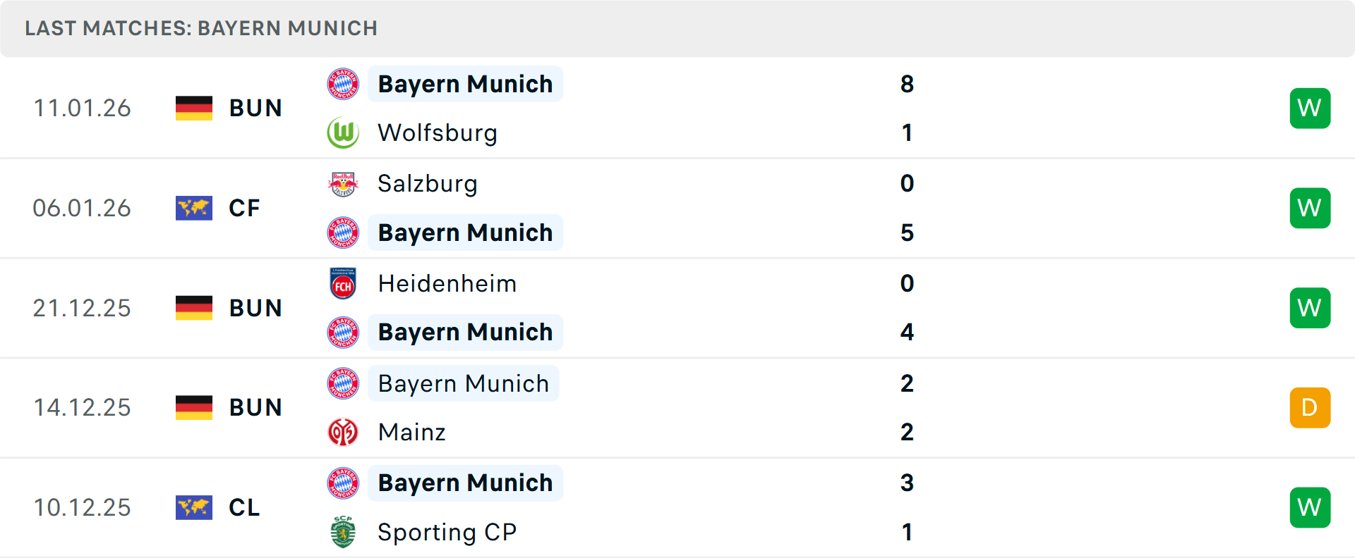 Tổng bàn thắng cả trận: Cả 10 trận gần đây của Bayern Munich đều có từ 4 bàn trở lên, gồm 9 trong số này ghi ít nhất 3 bàn.