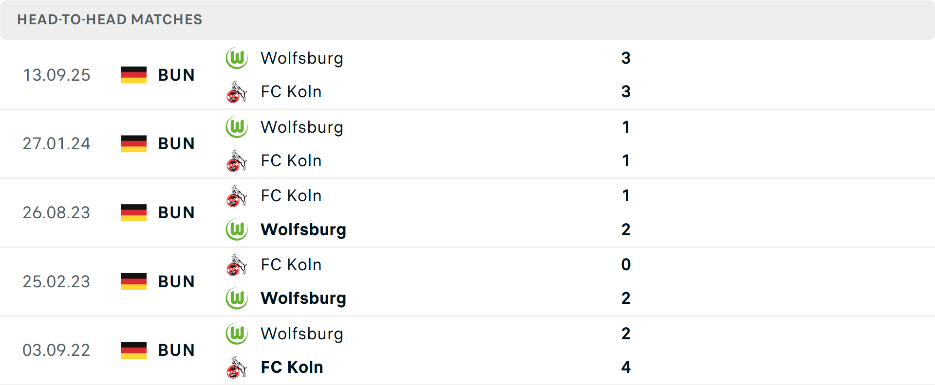 Tổng bàn thắng cả trận: Cả 4 trận gần đây của Koln đều vượt mốc tổng bàn thắng, tương tự là 7/9 trận trước đó của Wolfsburg.
