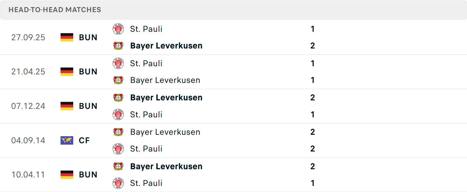 Tỷ lệ trận đấu: Leverkusen thắng cả 2 trận mới nhất theo tỷ số châu Á. Về phần mình, St. Pauli thua 4/6 trận gần đây.