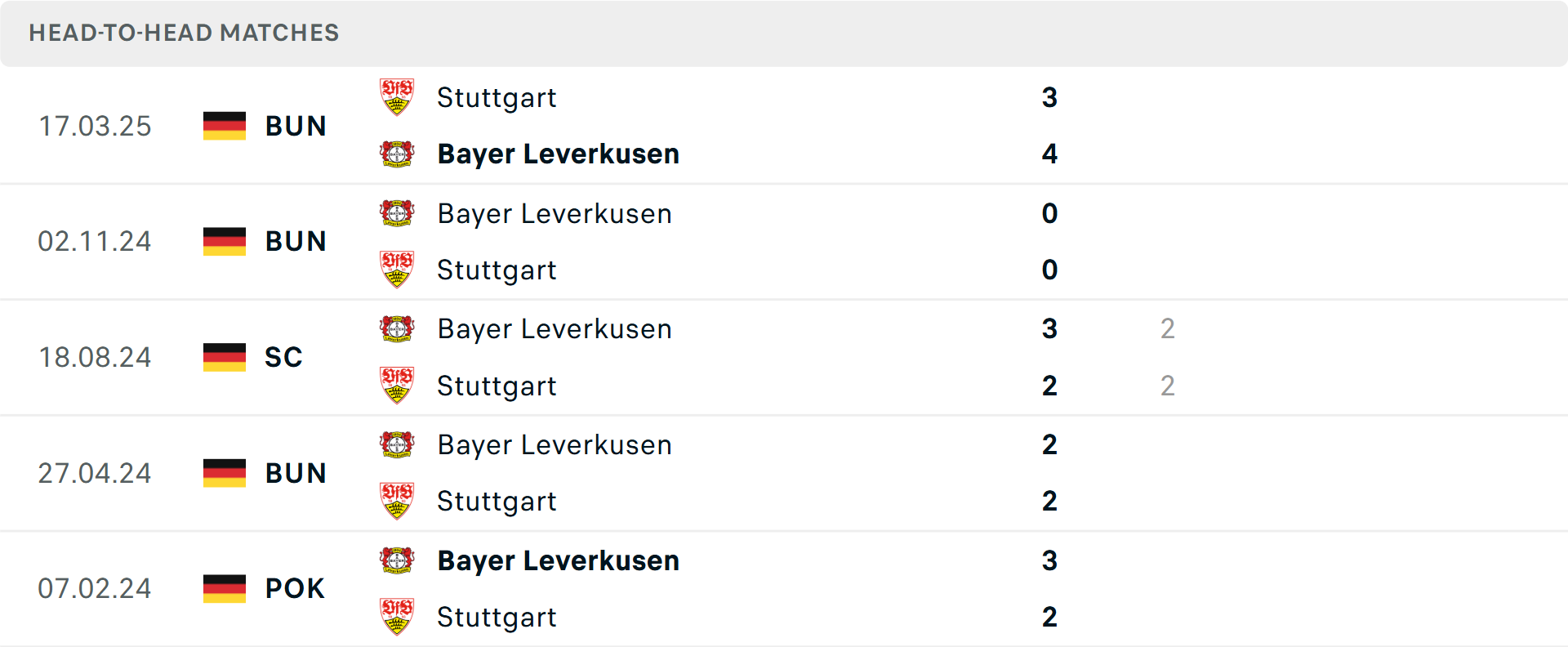 Dù Stuttgart có hàng thủ vừa giữ sạch lưới 2 trận liên tiếp, nhưng sức hỏa lực mạnh mẽ của Leverkusen tại sân nhà thường xuyên khiến họ gục ngã.