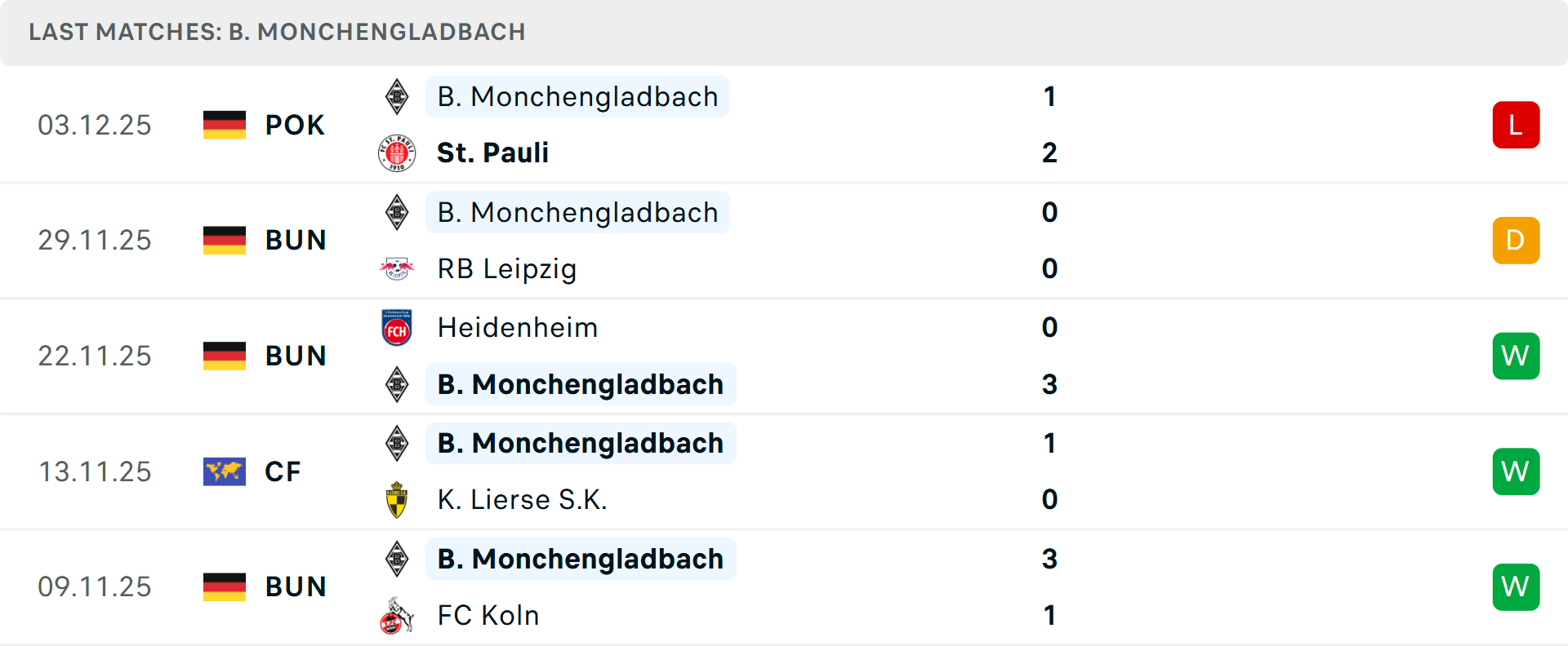 Trong khi đó, Monchengladbach dưới thời Eugen Polanski vừa trải qua thất bại 1-2 trước St Pauli ở Cúp Đức, nhưng đang có chuỗi 3 trận thắng liên tiếp tại Bundesliga, giúp họ tạo khoảng cách 5 điểm so với nhóm xuống hạng. Điểm sáng lớn của Gladbach là hàng công đã ghi từ 3 bàn trở lên trong 4/6 trận gần nhất.
