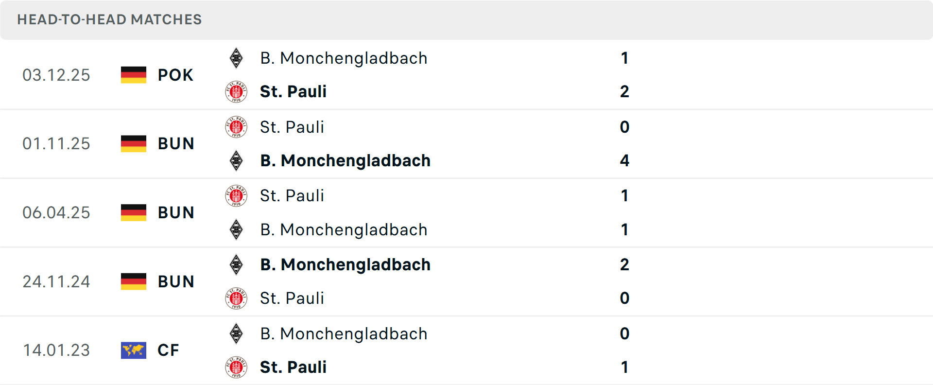 Tổng bàn thắng cả trận: Monchengladbach trải qua 9 trận liên tiếp chỉ ghi tối đa 1 bàn. Về phần mình, 2 trận mới nhất của St. Pauli dưới mốc tổng bàn thắng.