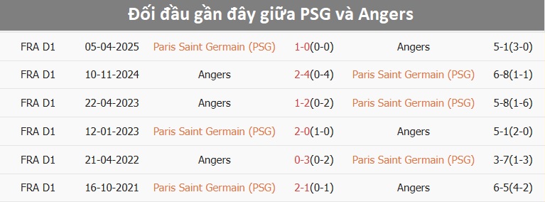 Tỷ lệ trận đấu: PSG thua Angers 3/4 cuộc đối đầu mới nhất theo tỷ số châu Á. PSG cũng toàn thua 3 trận mới nhất. Về phần mình, Angers thắng cả 3 trận vừa qua.