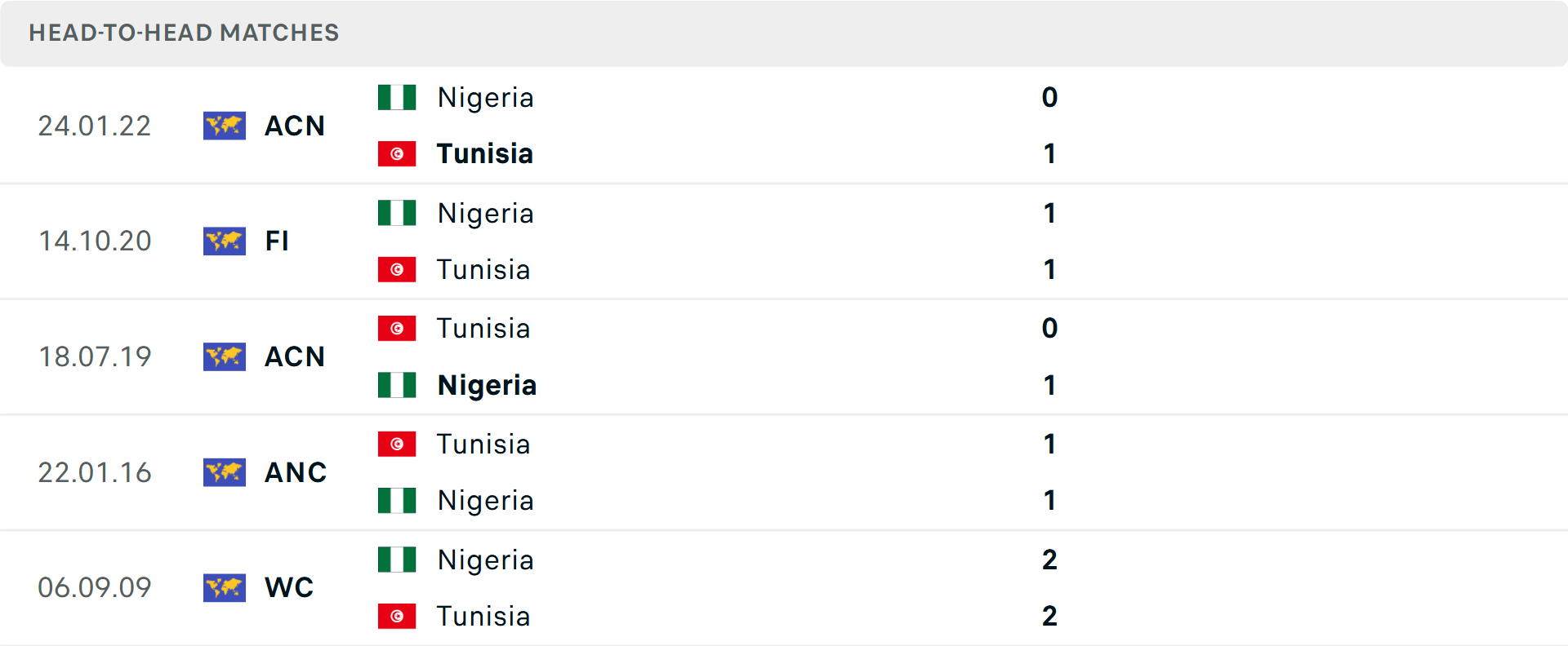 Lịch sử đối đầu đang ủng hộ Tunisia khi họ thắng 1-0 tại AFCON 2021 và chỉ thua 1 trong 8 lần chạm trán Nigeria gần nhất. Với sức mạnh tấn công đáng nể của Nigeria và sự lỳ lợm của Tunisia, một kịch bản chia điểm đầy kịch tính là rất khả thi.