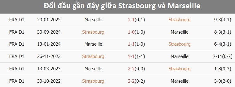 Tổng bàn thắng cả trận: 3/4 trận vừa qua của Strasbourg vượt mốc tổng bàn thắng. Marseille chỉ giữ sạch lưới 2/6 trận từ đầu mùa.