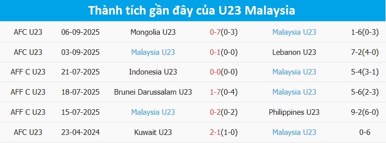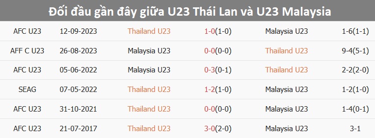 Tổng bàn thắng cả trận: Cả 3 trận gần đây của U23 Thái Lan đều vượt mốc tổng bàn thắng. Điều tương tự cũng xảy ra ở trận mới nhất của U23 Malaysia.