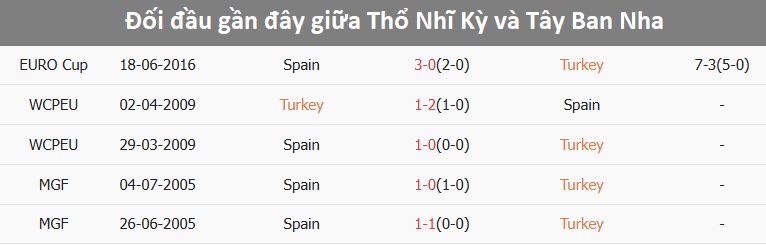 Tỷ lệ trận đấu: Tây Ban Nha thắng Thổ Nhĩ Kỳ cả 2 cuộc đối đầu mới nhất theo tỷ số châu Á. Tây Ban Nha cũng thắng 2/3 trận vừa qua.