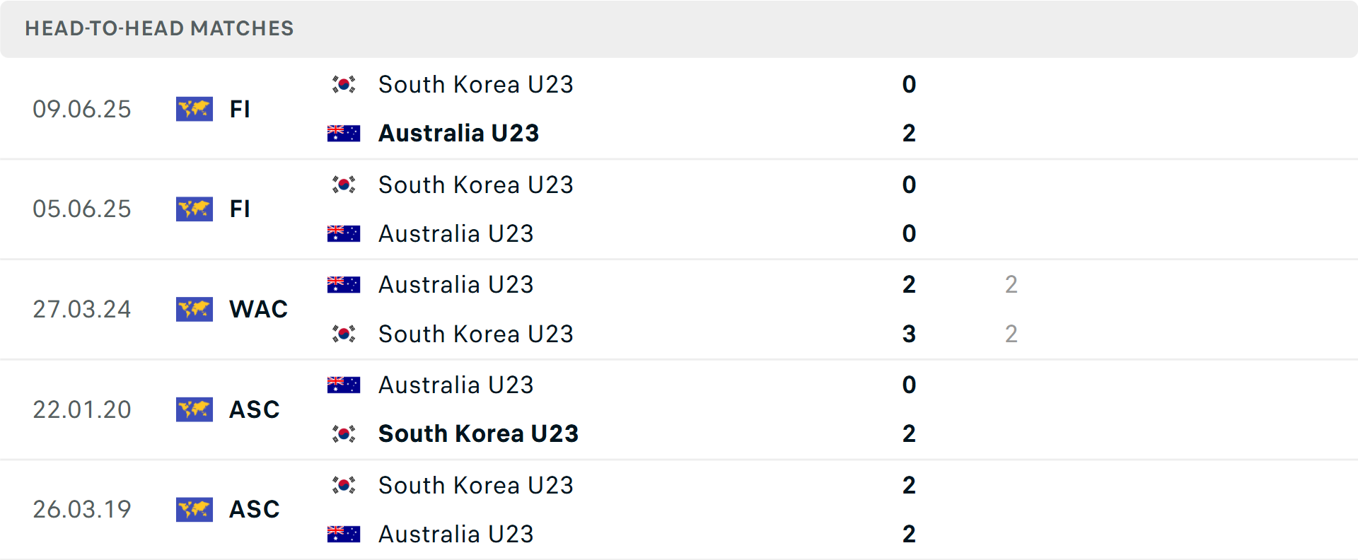 Tổng bàn thắng cả trận: 3/4 cuộc đối đầu trước đó giữa hai đội vượt mốc tổng bàn thắng, tương tự là 2/3 trận vừa qua của U23 Australia. Về phần mình, U23 Hàn Quốc đều lọt lưới 2 bàn ở 2 trận gần đây.