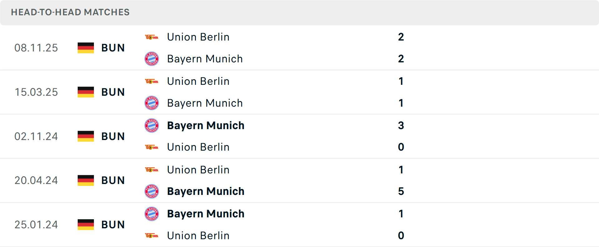Tỷ lệ trận đấu: Union Berlin toàn thắng Bayern Munich cả hai cuộc đối đầu mới nhất theo tỷ số châu Á. Union Berlin cũng thắng 2/3 trận mới nhất. Phía bên kia, Bayern Munich thua 3/4 trận gần đây.