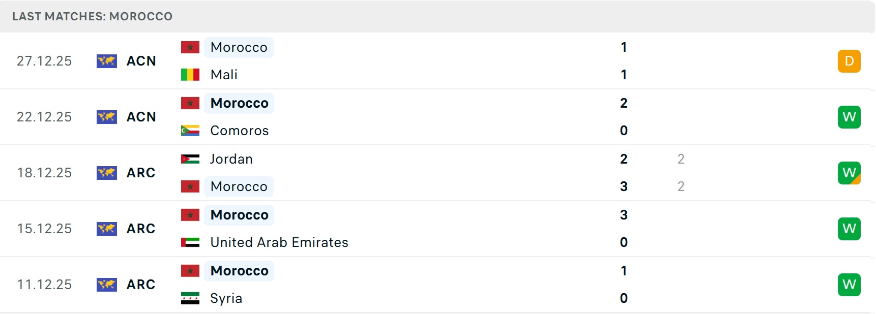 Trong khi đó, chủ nhà Marốc dù đã chắc suất đi tiếp nhưng đang đối mặt với áp lực lớn từ người hâm mộ sau màn trình diễn chưa thuyết phục (thắng Comoros 2-0 và hòa Mali 1-1). Với đẳng cấp vượt trội và sự trở lại của ngôi sao Achraf Hakimi, "Sư tử Atlas" quyết tâm giành 3 điểm để khẳng định vị thế ứng viên vô địch. Lịch sử đối đầu đang nghiêng hẳn về Marốc khi họ toàn thắng trong 5 lần gặp nhau gần nhất.