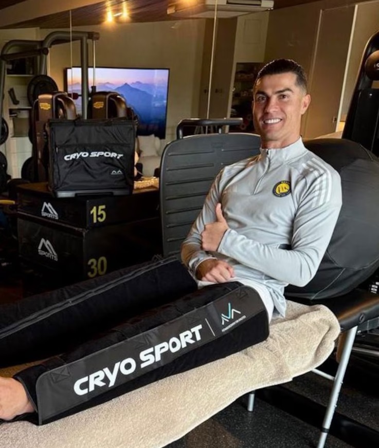 Trong bức ảnh, Ronaldo xuất hiện với nụ cười rạng rỡ trên môi, giơ ngón tay cái biểu thị sự ổn định khi đang sử dụng thiết bị nén ép trị liệu chuyên dụng để đẩy nhanh quá trình hồi phục.