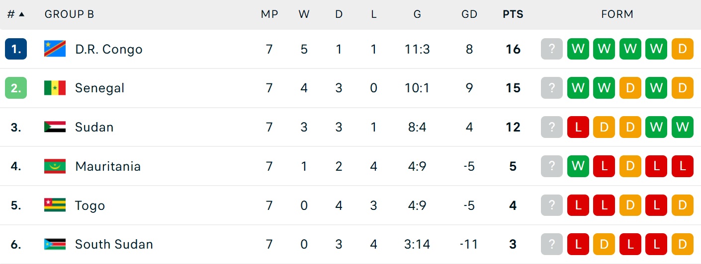 Bảng B vẫn đang cân bằng, với khoảng cách chỉ một điểm giữa hai đội đầu bảng Cộng hòa Dân chủ Congo và Senegal. Cú đúp của Cedric Bakambu và bàn thắng của Yoane Wissa đã giúp Cộng hòa Dân chủ Congo đánh bại Nam Sudan 4-1, trong khi Senegal vượt qua Sudan 2-0 tại Dakar nhờ công của Kalidou Koulibaly và Pape Matar Sarr. Hai đội bóng lớn sẽ gặp nhau tại Kinshasa vào thứ Ba.