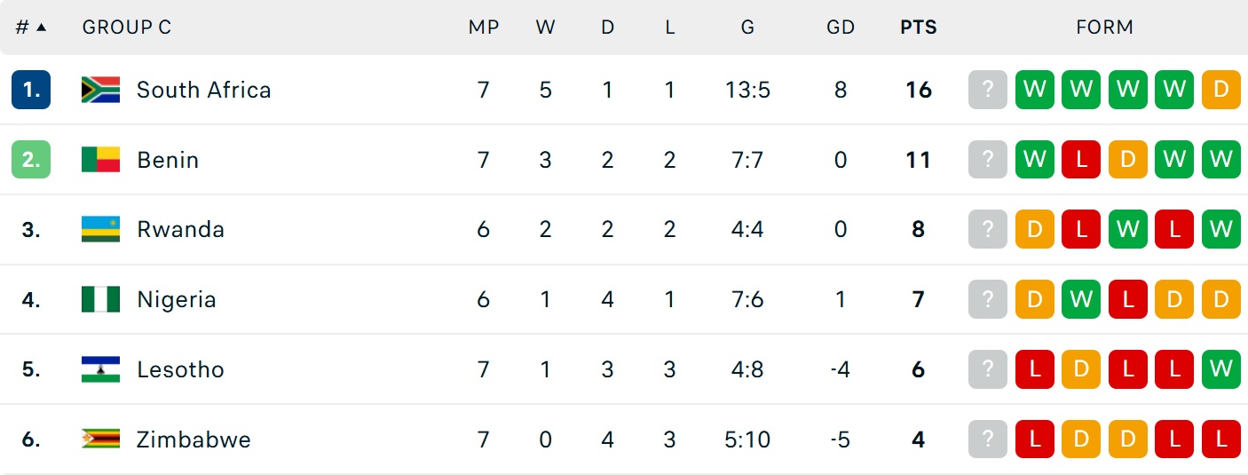 Nam Phi vẫn vững vàng nắm quyền kiểm soát bảng C, hơn Benin 5 điểm. Lyle Foster của Burnley ghi bàn giúp Bafana Bafana đánh bại Lesotho 3-0, trong khi bàn thắng của Steve Mounie đã mang về chiến thắng cho Benin trước Zimbabwe. Nigeria dù đang gặp khó khăn vẫn còn cơ hội cạnh tranh nhưng buộc phải thắng các trận đấu sắp tới với Rwanda và Nam Phi.