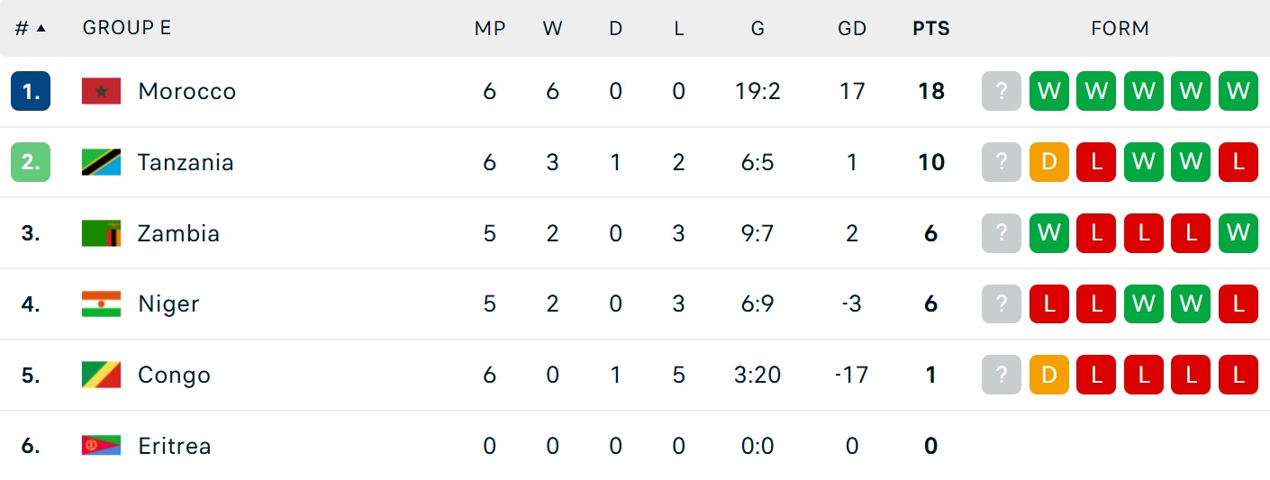 Ismael Saibari lập cú đúp, trong khi Ayoub El Kaabi, Hamza Igamane và Azzedine Ounahi cũng ghi bàn, giúp Marốc giữ vững thành tích toàn thắng. Đối thủ gần nhất của họ, Tanzania, đã bị Congo cầm hòa 1-1 trước đó, khiến họ chỉ có 10 điểm sau 6 trận so với 18 điểm của Marốc.