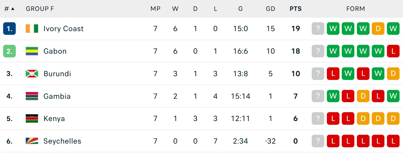 Ở bảng F, nhà vô địch châu Phi Bờ Biển Ngà đã trở lại ngôi đầu bảng sau chiến thắng sít sao 1-0 trước Burundi nhờ bàn thắng ở phút thứ ba của Vakoun Bayo. Bờ Biển Ngà hiện đang hơn Gabon một điểm, đội mà họ sẽ phải đối mặt vào thứ Ba.