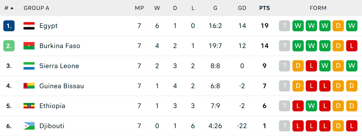 Trong một đêm bận rộn với 14 trận vòng loại trên khắp lục địa, Ai Cập vẫn duy trì vị trí dẫn đầu bảng A với chiến thắng 2-0 trên sân nhà trước Ethiopia. Mohamed Salah ghi bàn thắng thứ bảy từ chấm phạt đền, trước khi Omar Marmoush ghi thêm bàn thắng thứ hai theo cách tương tự. Burkina Faso vẫn kém 5 điểm sau khi đè bẹp Djibouti 6-0, với cú đúp của Dango Ouattara và Edmond Tapsoba.