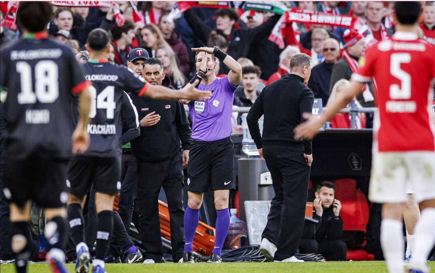 Trận chung kết Cúp quốc gia Hà Lan giữa AZ Alkmaar và NEC tại sân vận động De Kuip đã để lại một hình ảnh đi vào lịch sử bóng đá thế giới, nhưng không phải vì một bàn thắng đẹp. Khi trận đấu đang diễn ra căng thẳng, trọng tài chính Danny Makkelie bất ngờ thổi còi tạm dừng cuộc chơi, tiến về phía khu vực kỹ thuật và thản nhiên nghe điện thoại di động.