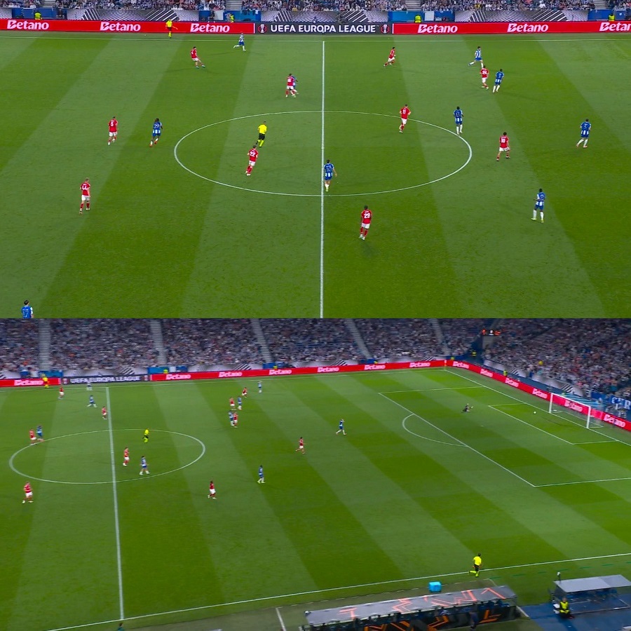 Trong một nỗ lực giữ quyền kiểm soát bóng và xoay chuyển hướng tấn công, Martim Fernandes quyết định thực hiện đường chuyền về cho thủ môn từ khoảng cách gần giữa sân.