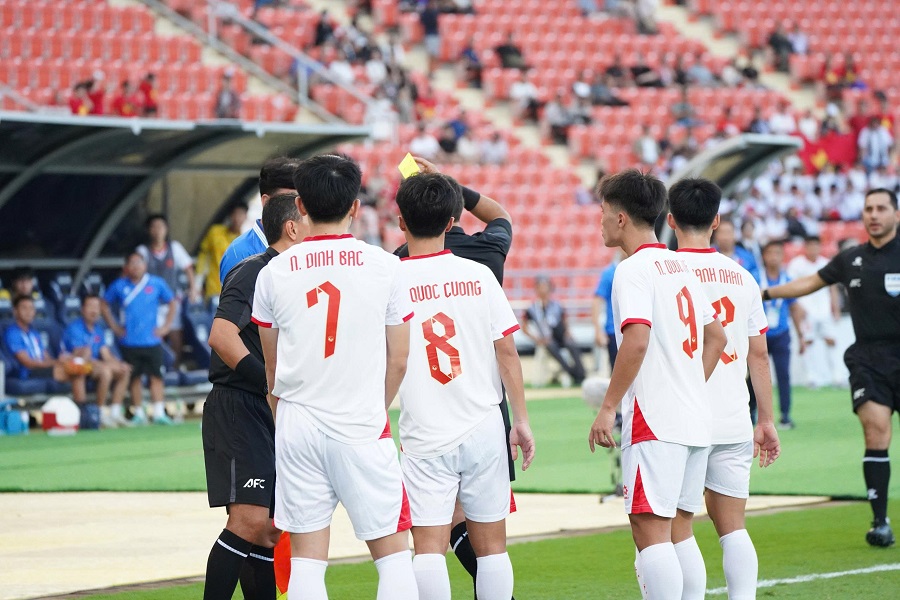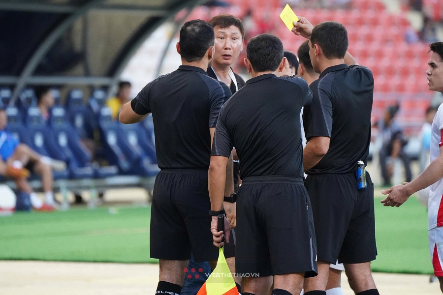 Đến lượt HLV Ha Hyeok-jun bên phía U22 Lào cũng nhận thẻ vàng khi ông và cộng sự tranh cãi về quyết định của trọng tài, nhưng ông Lutfullin không thay đổi lập trường.