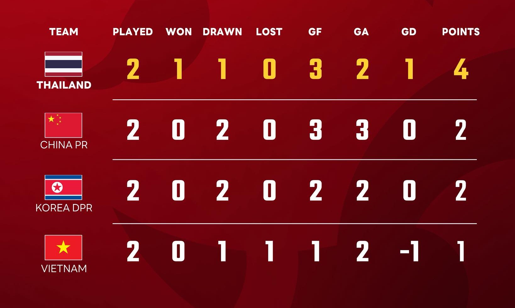 Trong khi đó, U23 Triều Tiên và U23 Trung Quốc cùng có 2 điểm khi đều hòa cả hai trận đã đấu. Điều này khiến cục diện bảng đấu trở nên khó lường trước lượt trận cuối.