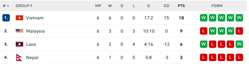 Về phía Malaysia, việc bị xử thua ở hai trận gặp Việt Nam và Nepal khiến họ chỉ còn 9 điểm, qua đó đánh mất cơ hội cạnh tranh vị trí dẫn đầu. Trong khi đó, Lào giành được 6 điểm sau hai chiến thắng trước Nepal để xếp thứ ba, còn Nepal đứng cuối bảng.