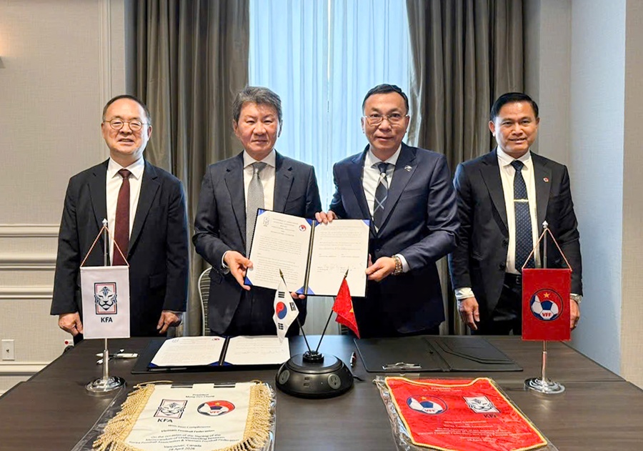 Chủ tịch LĐBĐ Việt Nam Trần Quốc Tuấn và Chủ tịch LĐBĐ Hàn Quốc Chung Mong Gyu đã tiến hành ký kết Biên bản ghi nhớ hợp tác (MoU) cho giai đoạn mới, đánh dấu bước tiến quan trọng trong mối quan hệ giữa hai nền bóng đá. Sự kiện diễn ra trong bối cảnh Đại hội FIFA lần thứ 76 sắp diễn ra, thể hiện quyết tâm duy trì và mở rộng hợp tác song phương.