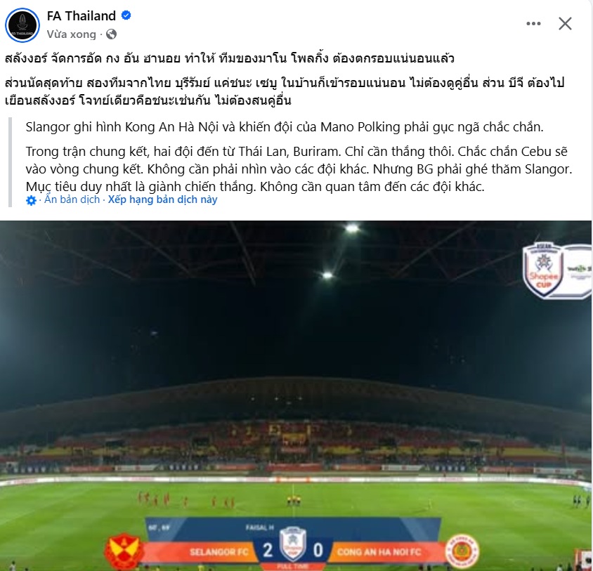 Nội dung bài đăng thể hiện rõ sự quan tâm đặc biệt: Buriram chỉ cần thắng Cebu là vào bán kết, trong khi BG Pathum phải đánh bại Selangor. Một cách “đếm vé” khá vội vàng, thậm chí hình ảnh minh họa cũng thiếu chỉn chu – điều hiếm thấy với fanpage của một liên đoàn bóng đá quốc gia tại giải đấu khu vực.