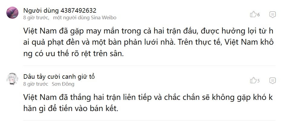 Trong bài tổng hợp đăng tải trên tờ Sina Sports, bên cạnh việc phân tích diễn biến các trận đấu, phần bình luận của độc giả Trung Quốc đã thu hút nhiều chú ý. Không ít CĐV cho rằng U23 Việt Nam đã nhận được sự hậu thuẫn lớn từ yếu tố may mắn trong hai trận toàn thắng trước U23 Jordan và U23 Kyrgyzstan.