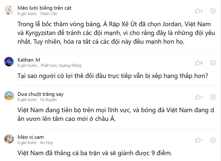 Bên cạnh đó, cũng xuất hiện những bình luận mang tính mỉa mai hướng về chủ nhà Saudi Arabia. Một CĐV nhắc lại: “Trong lễ bốc thăm, Saudi Arabia đã chọn Jordan, Việt Nam và Kyrgyzstan với suy nghĩ tránh được các đội mạnh. Nhưng thực tế cho thấy, tất cả những đối thủ đó đều đang chơi tốt hơn họ”.