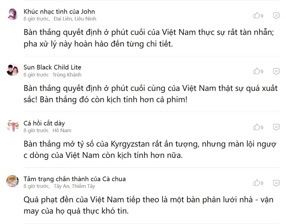 Tuy nhiên, không phải tất cả các bình luận đều mang tính hoài nghi. Nhiều CĐV Trung Quốc vẫn dành sự thừa nhận cho đội bóng áo đỏ. Một ý kiến nhận xét: “Bàn thắng quyết định ở những phút cuối của U23 Việt Nam thực sự rất đẳng cấp, hoàn hảo đến từng chi tiết”.