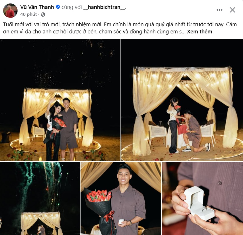 Kèm theo hình ảnh, Văn Thanh gửi gắm thông điệp đầy tình cảm: “Không cần quá hoàn hảo, chỉ cần đúng người, đúng khoảnh khắc. Món quà mở đầu cho lời hứa, lời cam kết quan trọng nhất… Làm vợ anh nhé!”. Được biết, màn cầu hôn này thực chất đã diễn ra từ tối 29/1 tại một bãi biển ở Huế, nhưng đến nay anh mới công khai.