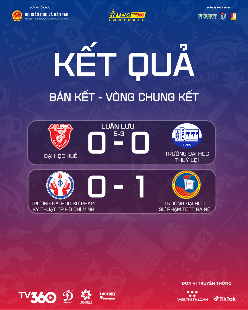 Như vậy trận chung kết NUC 2025 Cúp TV360 lúc 14h00 ngày 29/11 sẽ là cuộc đối giữa Đại học Huế và Trường Đại học Sư phạm TDTT Hà Nội.