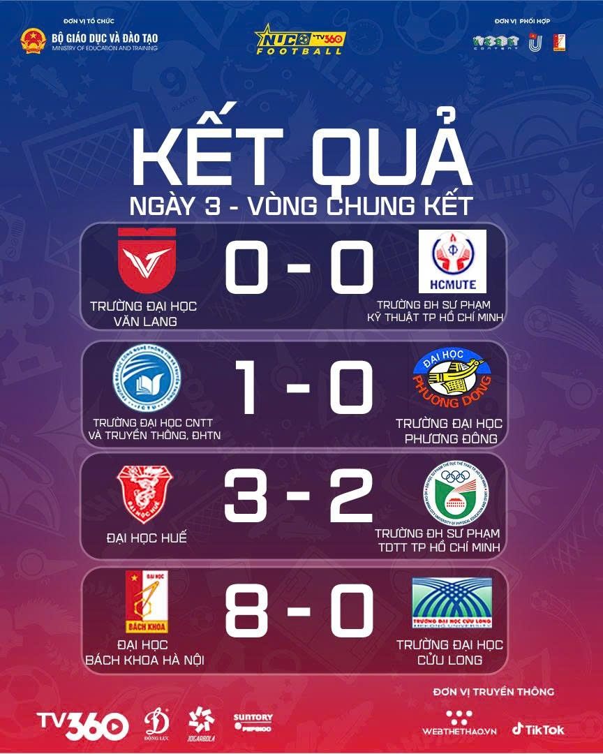 Ở trận đấu tiếp theo cũng của bảng B giữa Trường Đại học Công nghệ thông & truyền thông - Đại học Thái Nguyên và Trường Đại học Phương Đông có kết quả thắng thua, và đại diện đất chè là đội giành 3 điểm với tỷ số tối thiểu 1-0. Trận thắng thứ hai liên tiếp đồng nghĩa thầy trò HLV Ngô Mạnh Cường trở thành đội đầu tiên có mặt ở tứ kết. Phía đối diện, đoàn quân của HLV Tiến Trung sau 2 trận trắng tay đã sớm phải ngồi ngoài cuộc đua. Như vậy, tấm vé tứ kết còn lại của bảng B sẽ là cuộc đấu giữa VLU và HCMUTE.