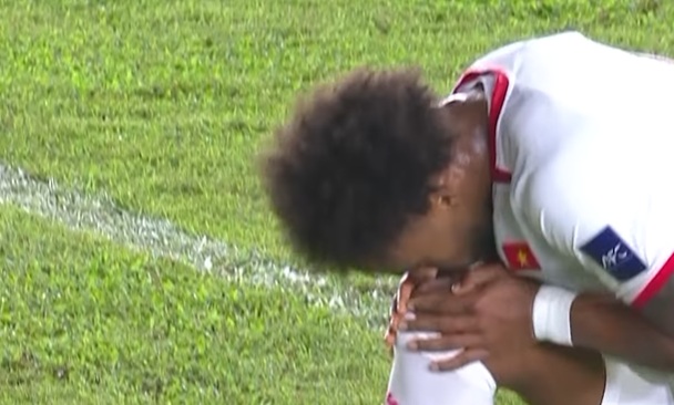 Cú sút quyết đoán tung lưới đối thủ, một pha dứt điểm đủ hiểm để thủ môn Lào hoàn toàn bó tay. Nhưng điều khiến tất cả phải nghẹn lại là khoảnh khắc sau đó: Xuân Son quỳ xuống, cúi đầu, và nhẹ nhàng đặt nụ hôn lên đầu gối của chính mình.