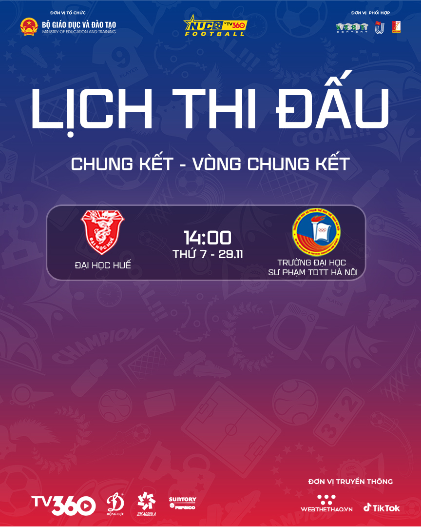 Như vậy trận chung kết NUC 2025 Cúp TV360 lúc 14h00 ngày 29/11 sẽ là cuộc đối giữa Đại học Huế và Trường Đại học Sư phạm TDTT Hà Nội.
