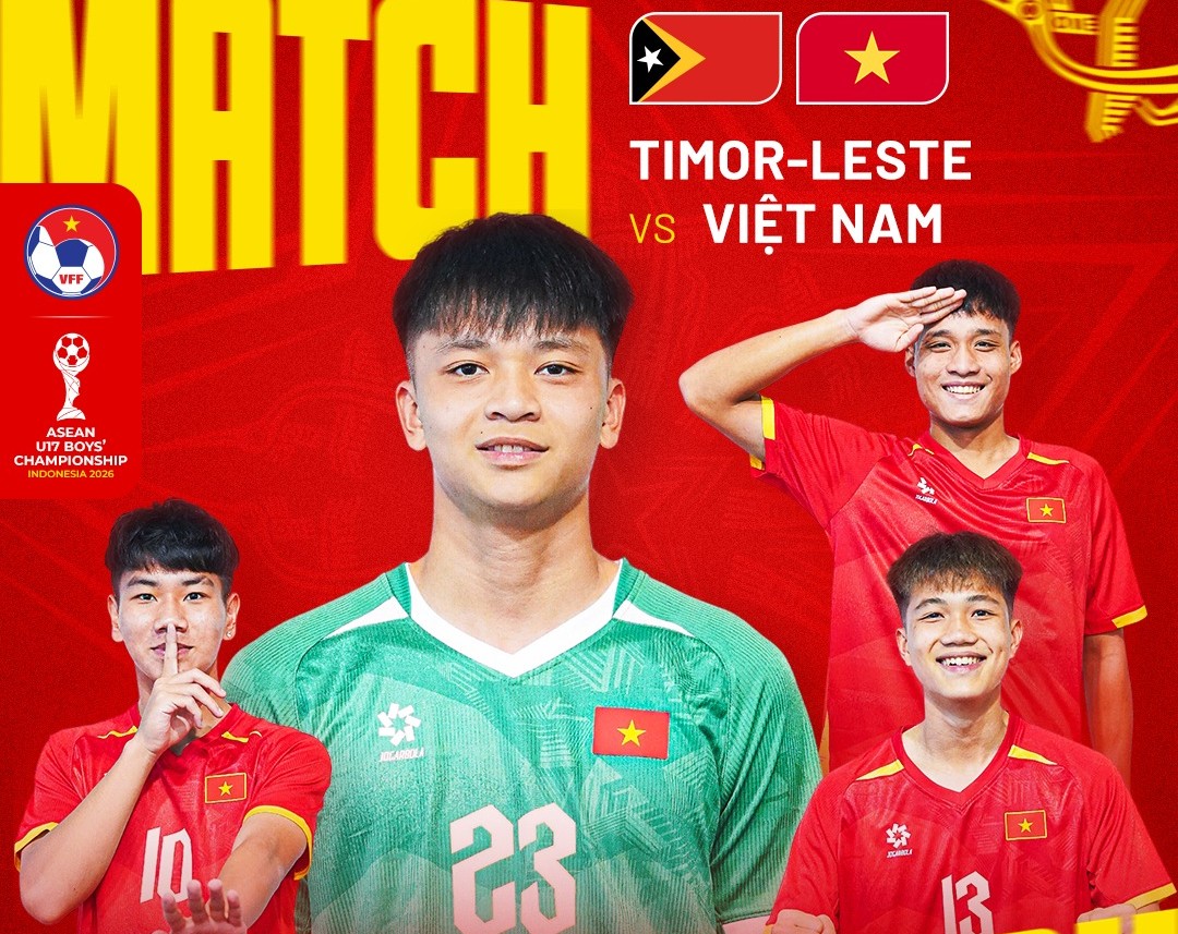 Link xem trực tiếp trận bóng đá U17 Việt Nam vs U17 Timor Leste thuộc U17 Đông Nam Á 2026. Cập nhật kênh phát sóng, link trực tuyến U17 Việt Nam vs U17 Timor Leste lúc 15h30 ngày 16/4.