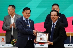 Ông Đỗ Quang Vinh, con trai cả bầu Hiển đến tham dự lễ xuất quân thi đấu hạng Nhất 2023/2024 của CLB SHB Đà Nẵng và “giao" chỉ tiêu thăng hạng mùa này cho đội bóng.