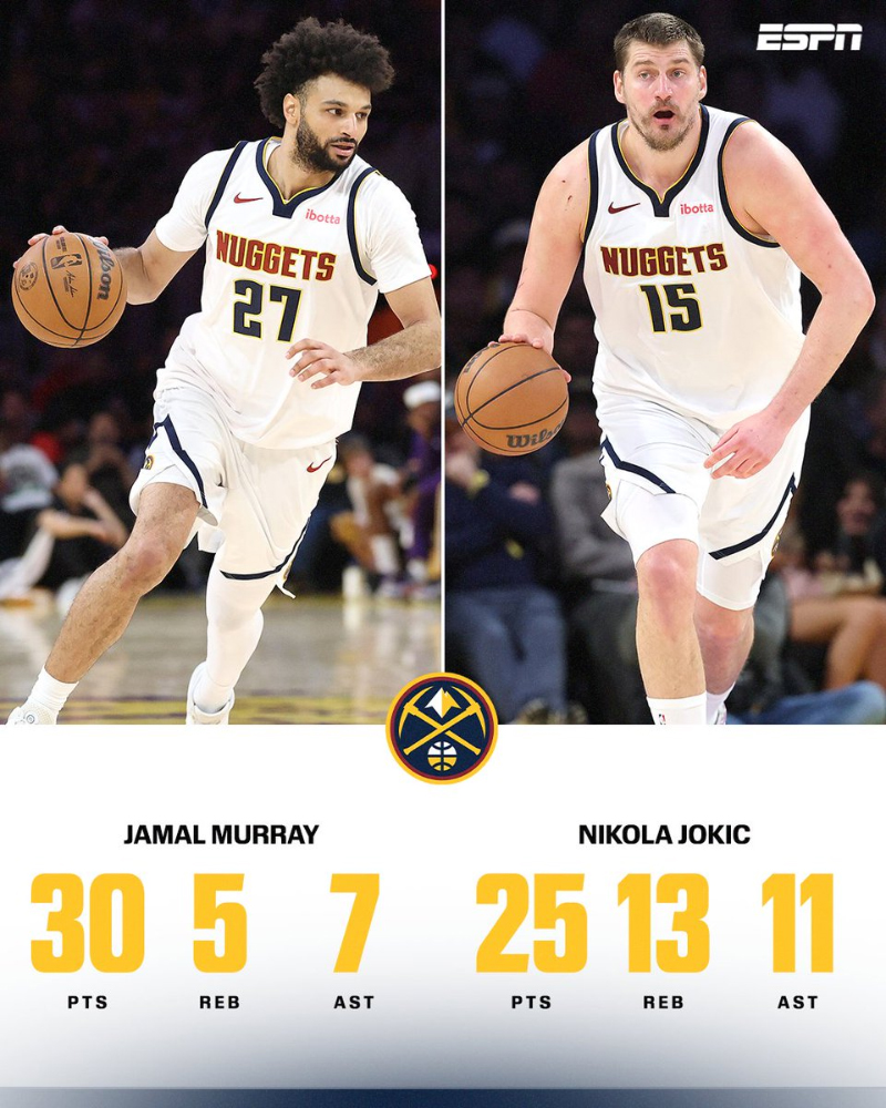 Như thường lệ, Nikola Jokic và Jamal Murray lại tiếp tục sắm vai trò dẫn dắt buổi diễn cho đội chủ nhà. Jokic đã ghi nhận một cú triple-double với 25 điểm, 13 pha bắt bóng bật bảng và 11 đường kiến tạo, trong khi Murray đóng góp với số điểm cao nhất trận là 30 điểm, 7 kiến tạo và 5 rebounds.