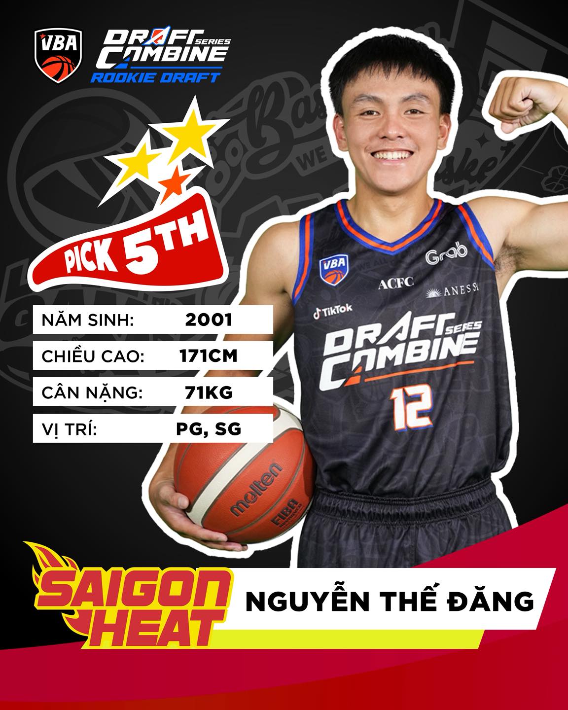 Với pick thứ 5, đội bóng từng 5 lần vô địch VBA là Saigon Heat đã lựa chọn Nguyễn Thế Đăng, cái tên có thể coi là giàu kinh nghiệm nhất trong nhóm 6 cầu thủ được gọi tên ở VBA Rookie Draft 2026. Thế Đăng sinh năm 2001, sở hữu chiều cao 1m71, chơi ở vị trí hậu vệ và coi việc thi đấu cho Saigon Heat là mơ ước trong nhiều năm qua.